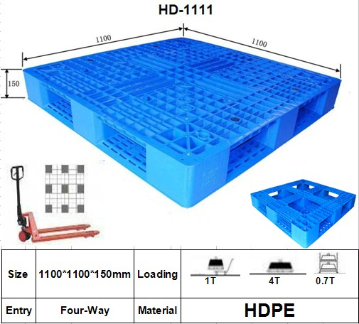 Größe: L1100*B1100*H150mm Eingangstyp: 4-Wege-Stil: Einseitig, mit Stahlrohren Dynamische Belastung: 1 t Statische Belastung: 4 t Regaltragfähigkeit: 0,7 t Material: HDPE- oder PP-Kunststoffpaletten mit Bilderrahmenboden, regalfähig, Gitter – 1 Merkmale: 1) Rutschfester Gummi eingelegt 2) Vorteil der Kunststoffpalette: umweltfreundlich, langlebig, sicher, recycelbar, Hyginenisch, 4-Wege-Zugang, keine Termiten, keine Wartung 3) Hochwertige Palette zu konkurrenzfähigem Preis 4) Kunststoffpaletten bieten eine wirtschaftliche Alternative zu Holzpaletten oder Kufen. 5) Recycelbar und waschbar 6) Zertifikate: CE, SGS, ISO 9001, ISO 14001 und OHSAS 18000 Über Palette: 1) Verschiedene Stile zur Auswahl. 2) Mit einer großen Auswahl an Größen zur Auswahl. 3) Farbe kann angepasst werden. 4) Hergestellt aus neuem Material HDPE. 5)Geeignet für den Regaltransport
